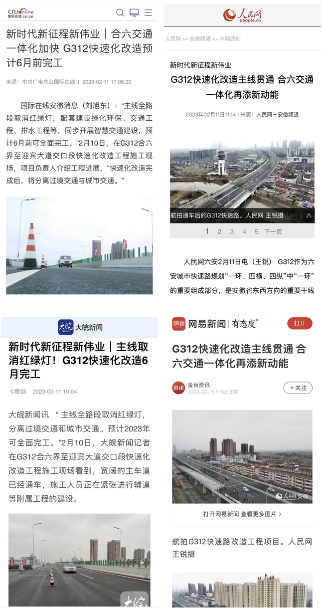 中央廣播電視總臺安徽總站、光明日報安徽記者站、人民網(wǎng)安徽、安徽日報、安徽廣播電視臺等中央駐皖新聞單位、省直及市縣媒體,重點報道路橋集團“G312快速化改造主線貫通 合六交通一體化再添新功能”。