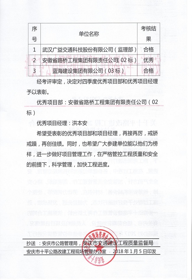 1月5日,我公司承建的安慶市十平公路改建工程項目在業主開展的2017年度四季度綜合考評中取得優異成績,受到業主表彰。項目部被授予“優秀項目部”稱號,洪本安同志被授予“優秀項目經理”稱號。