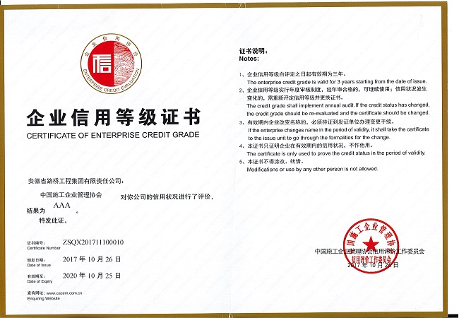 今年5月,在公司領導的高度重視下,公司組織申報2017年度工程建設社會信用企業,申報材料包括公司近年來的發展戰略、市場開拓、質量安全現狀、人力資源配置、管理能力、設備、財務等各類信息。8月份,中施企協信用評價專家組一行蒞臨我公司實地訪談,詳細了解我公司管理情況。通過實地訪談,各位專家一致認為我公司安全、質量、科技創新、環保增效、企管和規劃等內容滿足AAA級企業的評價標準。最終,公司以較高的評審分值,通過中施企協全國信用評價AAA級年度審核,獲評中施企協企業信用評價AAA級信用企業。