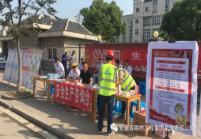 正值第17個全國“安全生產月”,6月15日上午,S215路基01標、路面標項目部聯合新杭鎮政府、公安消防大隊、交警隊、食品藥品監督管理局、國家電網、宣燃天然氣有限公司共同舉辦2018年“安全生產月”集中宣傳咨詢日活動。