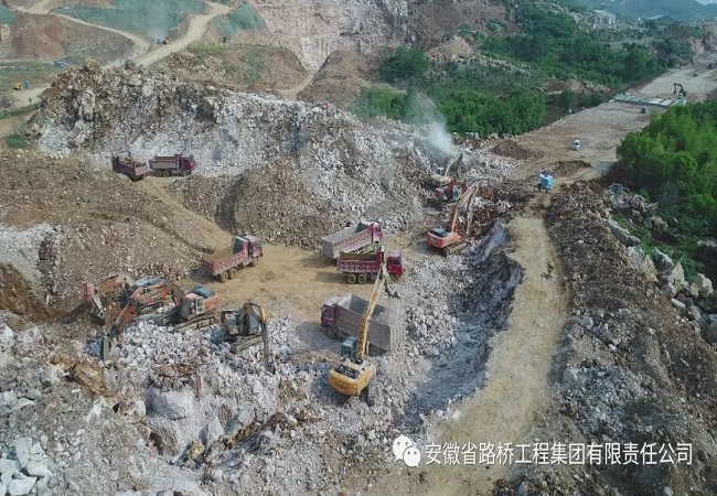 天石鈣業地處新杭服務區上行段,樁號K8+600-K8+800。這短短的200米范圍內遍布著硬質石山、低壓桿線、采石礦場、居民住房等,推進難度十分巨大,為了加快進度,項目部決定采用雙向推進的方法,由大小樁號同時向中間開挖,投入大量機械,提高施工效率。由于該段內多硬質石山,必須采用爆破開采,受限于政府的炸藥管制政策,工作開展較慢。為此,項目部積極與政府有關部門溝通協調,最終獲得了炸藥使用權,并采用超深孔爆破的方法大大提升了開采速度。針對斷點內的桿線、房屋問題,項目部積極協調,配合政府部門拆除紅線內房屋,并在獲得相關部門批準后,自行組織人員機械對桿線進行遷移,掃清了工作推進中的拆遷問題。