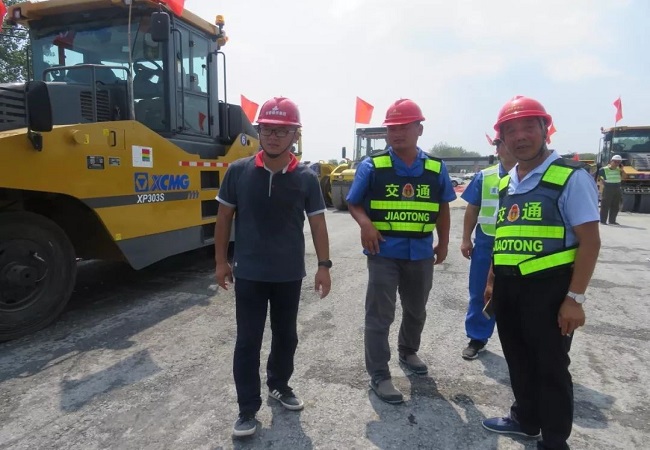 施工現(xiàn)場(chǎng)有16名工人來(lái)回忙碌,2臺(tái)福格勒2100-3L瀝青攤鋪機(jī)、10臺(tái)壓路機(jī)轟鳴作業(yè),160℃的瀝青下面層攤鋪在地面上,散發(fā)出陣陣青煙,現(xiàn)場(chǎng)熱浪一陣陣撲面而來(lái),員工們大干的激情格外飽滿(mǎn)。