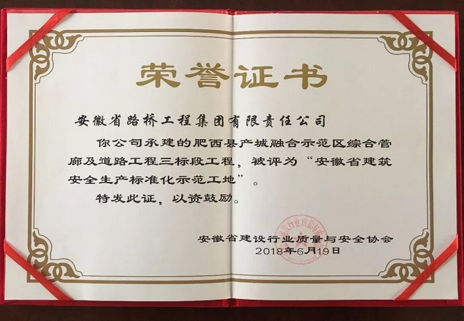 6月19日,安徽省建設行業質量與安全協會下發了2018年度第一批安徽省建筑安全生產標準化示范工地(小區)名單,并于近日完成了授牌。公司承建的肥西縣產城融合示范區綜合管廊及道路工程三標段項目榮獲“省級安全生產標準化示范工地”稱號。