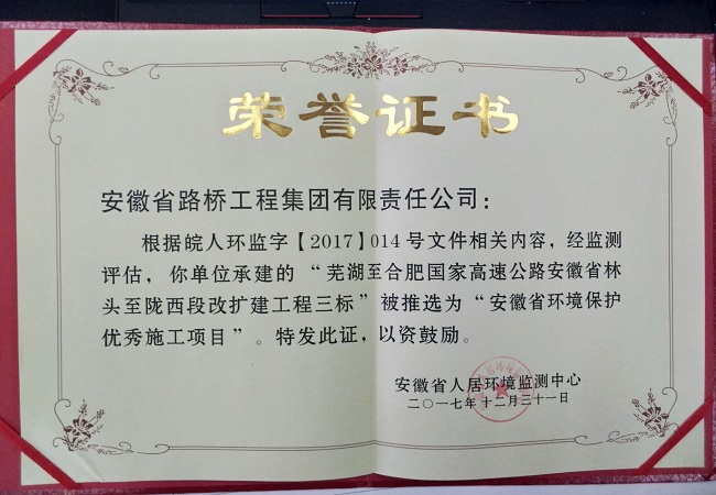 近日,我公司承建的蕪合高速改擴建03標項目部在安徽省人民環(huán)境監(jiān)測中心開展的2017年度評選中,喜獲“安徽省環(huán)境保護優(yōu)秀施工項目”榮譽。