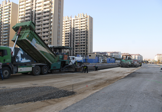 11月8日,洪河路瀝青下面層開始攤鋪,分項負責人及技術員們積極協調現場施工,嚴格把控工程質量,共完成瀝青攤鋪820米。