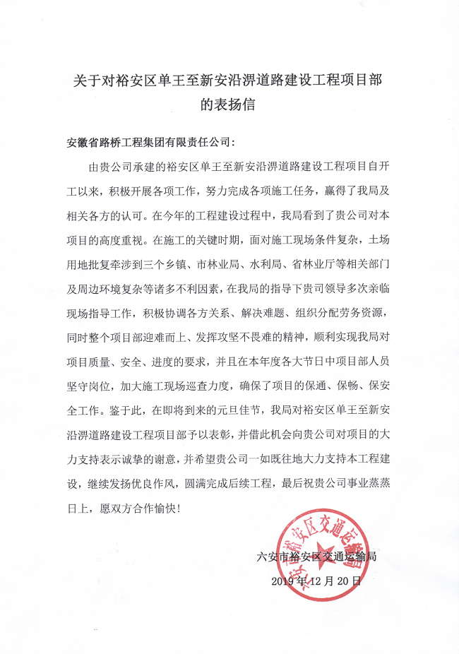 12月20日,一分公司裕安區單王至新安沿淠道路建設工程項目經理部收到六安市裕安區交通運輸局發來的表揚信。信中高度贊賞安徽路橋集團裕安區單王至新安沿淠道路建設工程項目部迎難而上、攻堅不畏難的精神,充分肯定了項目部在質量控制、安全管理、施工進度等方面取得的成績,并對公司為六安市發展作出的努力和貢獻表示衷心感謝。