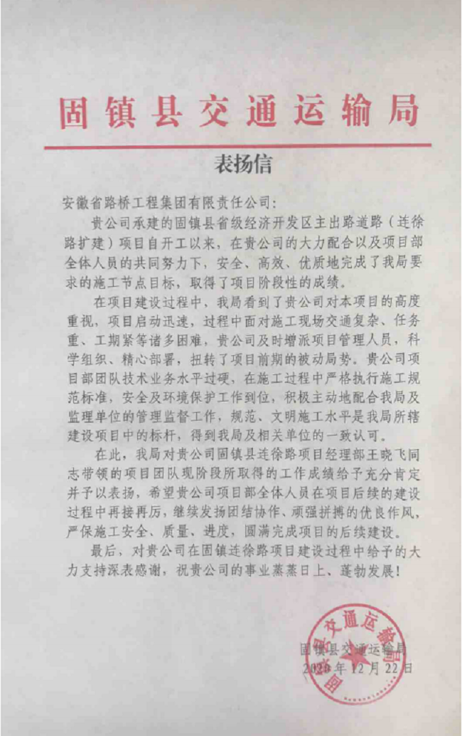 此次業(yè)主的表揚(yáng)信是對(duì)項(xiàng)目全體人員艱苦付出的褒獎(jiǎng),更是對(duì)項(xiàng)目團(tuán)隊(duì)的激勵(lì)。固鎮(zhèn)連徐路項(xiàng)目全體人員表示,在后續(xù)的項(xiàng)目建設(shè)中會(huì)團(tuán)結(jié)協(xié)作、規(guī)范施工,確保項(xiàng)目按期、按質(zhì)、按量圓滿完成,給業(yè)主單位和連徐路周邊住戶交上一份滿意的答卷。