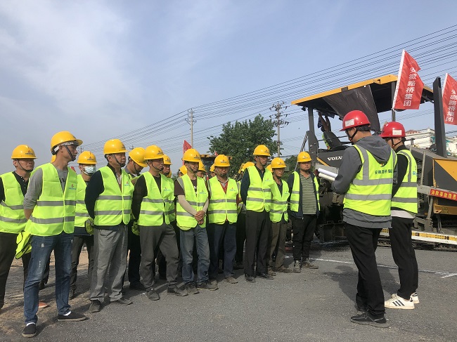 施工前首先對現(xiàn)場技術(shù)、安全、機(jī)械操作手等相關(guān)人員進(jìn)行了詳細(xì)的安全技術(shù)交底和崗前培訓(xùn);細(xì)化管理、施工人員責(zé)任分工,周密安排瀝青混合料的拌和、運(yùn)輸、攤鋪、碾壓、接縫以及開放交通等各項(xiàng)工作。在施工現(xiàn)場,2臺(tái)攤鋪機(jī)、3臺(tái)雙鋼輪壓路機(jī)、2臺(tái)膠輪壓路機(jī)、10輛運(yùn)輸車,在指揮人員的調(diào)度下,有條不紊地工作著,施工人員的指揮聲和施工機(jī)械的轟鳴聲交織在一起,形成一首繁忙、熱鬧的施工“交響曲”。