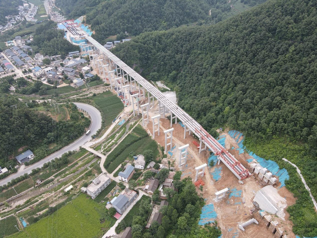 西溝大橋全長510米,預制梁板共計165片。橋梁位于分離式路基段,上跨當地村道和河流,橋梁附近埋設有國防光纜,部分墩柱處于山地陡坎溝壑之間,施工難度大、安全風險高。該橋橋墩采用柱式墩、樁基礎,橋臺采用柱式臺、樁基礎,于5月12日開始架梁,6月21日完工。參建人員克服地質條件復雜、施工場地狹窄、雷雨季節、高墩施工安全風險高等困難,有序推進全橋施工。