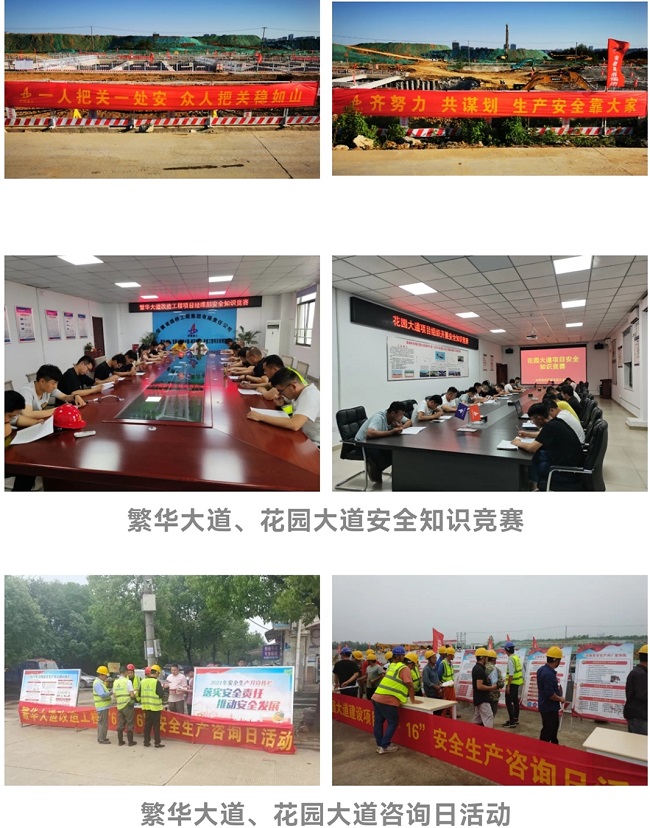 強化宣傳引領,營造安全生產濃厚氛圍有動作。為進一步提高安全生產宣傳教育的覆蓋面和影響力,增強職工和勞務工人關注安全、重視安全的自覺性、主動性,一分公司各項目積極落實“安全生產月”宣傳活動,營造出濃厚氛圍。一是相繼開展安全專題教育和安全知識競賽等活動,通過深入學習習近平總書記關于安全生產重要論述、觀看安全教育警示視頻、開展安全知識競賽,讓安全生產觀念植根于項目職工心中。二是精心制作“安全生產月”宣傳展板,在各項目部及施工現場醒目位置粘貼宣傳畫,懸掛關于安全生產各類橫幅、標語,時刻提醒一線員工及工人關注安全。三是開展“6.16安全咨詢日”活動,設置安全宣傳咨詢點,通過發放安全知識宣傳單、宣傳手冊以及現場解答的方式,向勞務工人宣傳安全生產、防災減災、應急救援知識和技能,形成了安全生產人人知曉、項目員工及勞務工人共參與的良好氛圍。