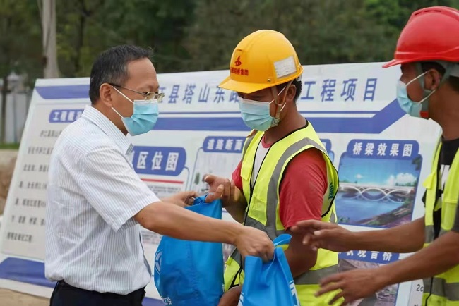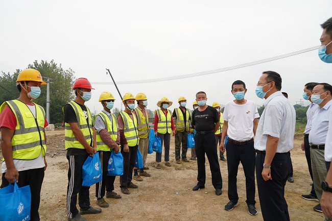 許華為一行深入施工現場,詳細了解施工進度、工作環境和現場工人的工作強度,并為一線人員送去夏季防暑降溫慰問品。
