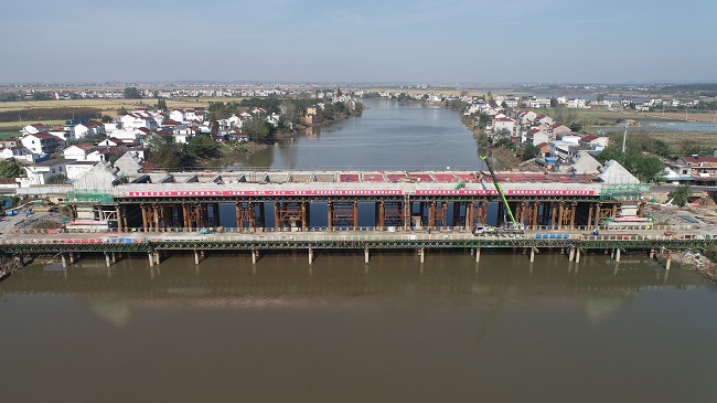該橋總體施工方案為先梁后拱,系梁、橫梁及橋面板采用水中支架現澆施工,待預應力張拉完成后,開始拼拱支架及拱肋節段安裝,施工工序復雜、精度要求高、操作難度大。為保障施工安全和施工質量,項目部做好組織和充分準備,對施工方案進行反復詳細研究,多次組織施工人員進行施工交底,并按照安全環保要求,認真做好覆蓋密目網、道路圍擋、灑水降塵等工作。澆筑現場,技術人員盯班值守,及時做好技術指導,解決遇到困難,確保施工順利推進。