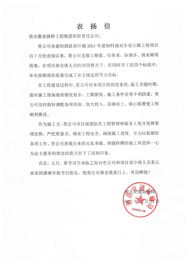 12月25日,六分公司泗縣黃圩鎮(zhèn)項目收到泗縣交通運輸局發(fā)來的表揚信。信中對項目部展現(xiàn)出的無私奉獻(xiàn)、頑強拼搏的施工風(fēng)范和一心為業(yè)主服務(wù)的理念提出高度贊揚。
