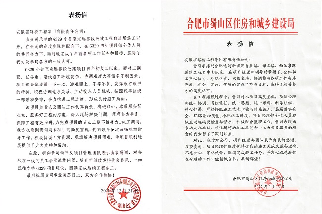 近日,我公司承建的G329小普至定遠(yuǎn)界段改建項(xiàng)目,合肥運(yùn)河新城酒香泉路、紹章路、西湯泉路道路工程項(xiàng)目先后榮獲業(yè)主來信表揚(yáng),兩項(xiàng)目業(yè)主對我公司項(xiàng)目高標(biāo)準(zhǔn)、高質(zhì)量完成節(jié)點(diǎn)任務(wù)予以高度認(rèn)可和贊揚(yáng),對公司以及項(xiàng)目管理團(tuán)隊(duì)表示衷心的感謝。