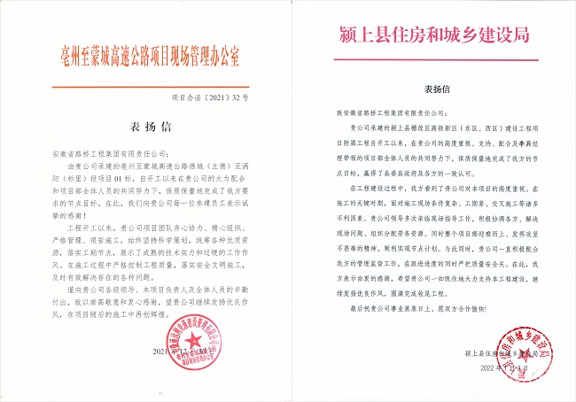 近日,我司承建的亳州至蒙城高速公路譙城(立德)至渦陽(標里)01標項目、潁上縣棚改區高鐵新區(東區、西區)建設工程項目附屬工程先后榮獲業主來信表揚,兩項目業主對我司項目保質保量地完成節點目標給予高度贊賞和認可,對分公司及項目管理團隊的付出和努力予以表揚并表示感謝。