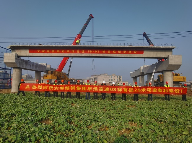 2022年1月12日上午,經(jīng)過兩臺吊車配合,安徽路橋集團阜陽至淮濱高速公路安徽段FH-03標項目K26+173.5 S318分離式立交首榀25m箱梁順利架設(shè)完成,橋梁上部結(jié)構(gòu)施工正式啟動。