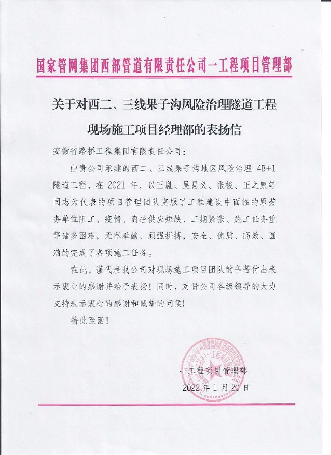 近日,國家管網(wǎng)集團(tuán)西部管道有限責(zé)任公司一工程項(xiàng)目管理部向安徽路橋集團(tuán)發(fā)來表揚(yáng)信,對新疆果子溝西氣東輸現(xiàn)場施工項(xiàng)目團(tuán)隊(duì)的辛苦付出表示衷心的感謝并給予表揚(yáng)。