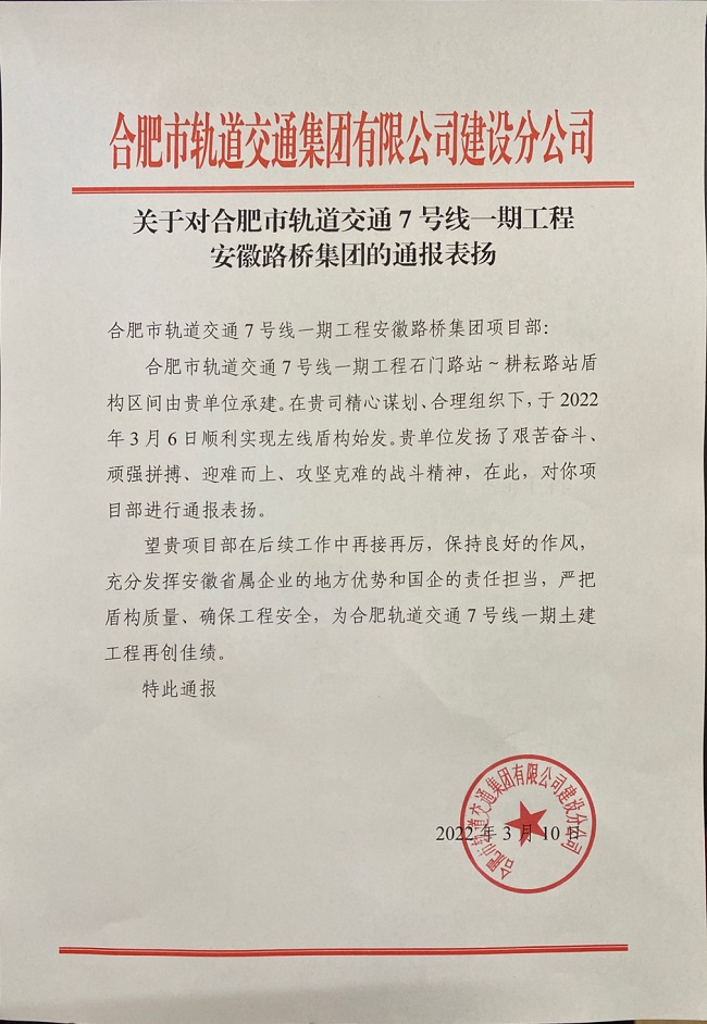 3月10日,合肥市軌道交通集團有限公司建設分公司發(fā)來表揚信,對安徽路橋集團軌道交通七號線項目部順利實現(xiàn)施工節(jié)點目標任務提出表揚。