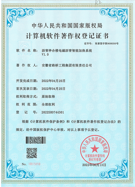 近日,國家版權局傳來喜訊,安徽路橋集團設備租賃分公司自主研發、申報的《瀝青拌合樓電磁瀝青智能加熱系統V1.0》成功獲得國家版權局計算機軟件著作權授權,并取得著作權登記證書。