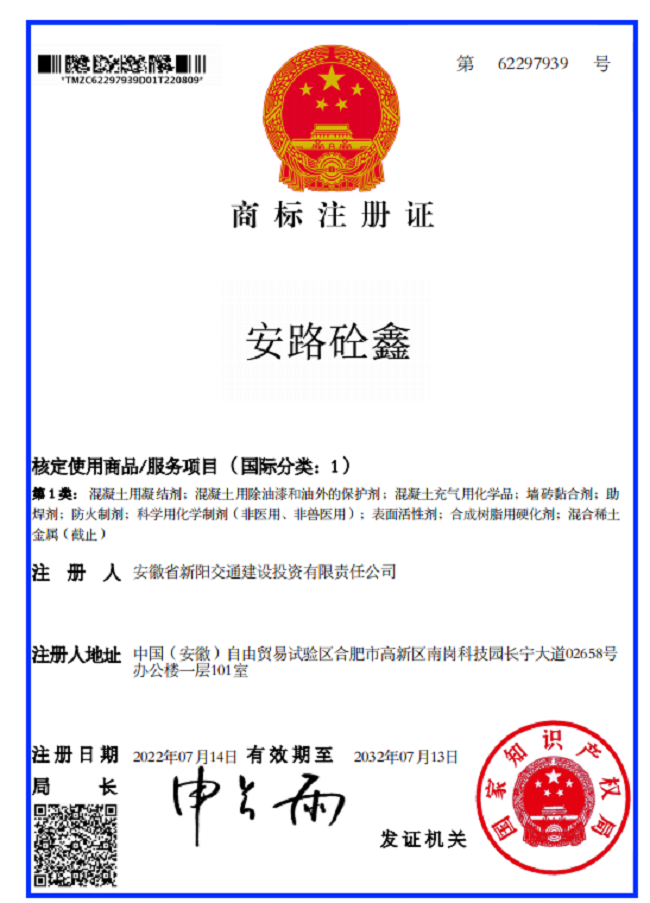 近日,新陽公司申報的“安路砼鑫”商標經過國家知識產權局的初審、公審等一系列法定程序,已于近日正式取得國際分類第1類商標注冊證書。