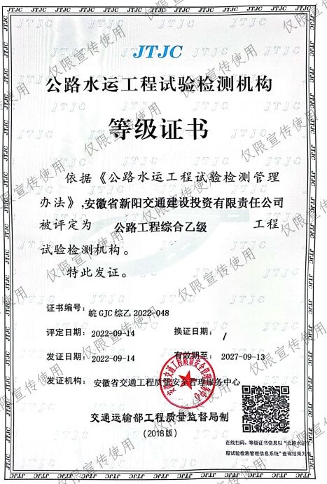 2022年9月14日,經(jīng)安徽省交通工程質(zhì)量安全管理服務中心核發(fā),安徽省新陽交通建設(shè)投資責任公司成功獲批公路工程綜合乙級試驗檢測機構(gòu)。