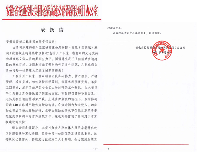 表揚(yáng)信中指出,亳州預(yù)制02標(biāo)項(xiàng)目自開工以來,項(xiàng)目部面對(duì)當(dāng)?shù)匾咔樾蝿?shì)嚴(yán)峻、土地資源緊張等諸多不利因素,項(xiàng)目團(tuán)隊(duì)齊心協(xié)力、精心組織、嚴(yán)格管理、攻堅(jiān)克難,始終堅(jiān)持科學(xué)策劃,統(tǒng)籌各種優(yōu)質(zhì)資源,多方協(xié)調(diào)溝通140畝臨時(shí)用地作為場(chǎng)站選址,在短時(shí)間內(nèi)加大投入、加班加點(diǎn)完成了場(chǎng)站駐地建設(shè),在資金短缺的情況下仍能盡職盡責(zé)率先完成預(yù)制構(gòu)件的首件澆筑工作,展示了雄厚的專業(yè)實(shí)力和過硬的工作作風(fēng),為本項(xiàng)目早日具備開工條件做出了突出的貢獻(xiàn)。