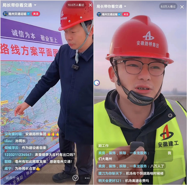 孫善豹一行先后來到立德樞紐、機(jī)場互通施工現(xiàn)場,以火熱的大干場面為背景,向廣大網(wǎng)友詳細(xì)介紹了亳蒙高速項(xiàng)目規(guī)劃設(shè)計(jì)、建設(shè)進(jìn)度、現(xiàn)場管理等情況。在直播過程中,安徽路橋集團(tuán)亳蒙高速項(xiàng)目負(fù)責(zé)人圍繞關(guān)鍵控制節(jié)點(diǎn)、成果進(jìn)展等項(xiàng)目建設(shè)專業(yè)問題,與網(wǎng)友親切互動交流,答疑解惑,氣氛和諧融洽。