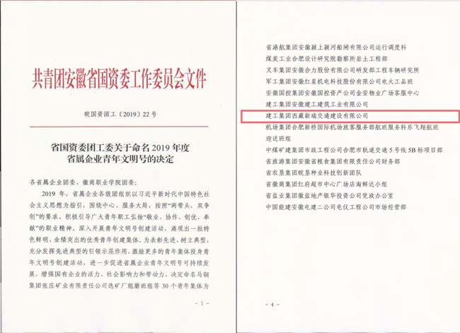 近日,省國資委團工委命名表彰2019年度省屬企業青年文明號集體,安徽路橋集團西藏新瑞公司獲“2019年度省屬企業青年文明號”榮譽稱號!