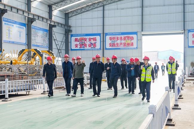 程本文、姚軍等人先后參觀了項目部駐地、工地試驗室和場站標準化建設,實地察看了數(shù)控鋼筋籠滾焊機加工、數(shù)控智能鋼筋彎曲等工藝,對項目企業(yè)文化宣傳、標準化建設、智能化設備運用及安全文明施工管理等工作展開深入交流與探討。