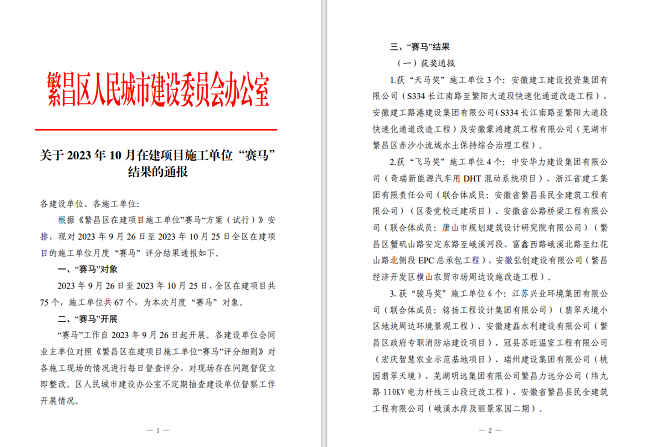 近日,由繁昌區人民城市建設辦公室組織的繁昌區在建項目施工單位月度“賽馬”評分考核活動中,建工建投集團S334長江南路至繁陽大道段快速化通道改造工程02標項目從參賽的67個施工單位中脫穎而出,以總分排名第一的優異成績獲評“天馬獎”!