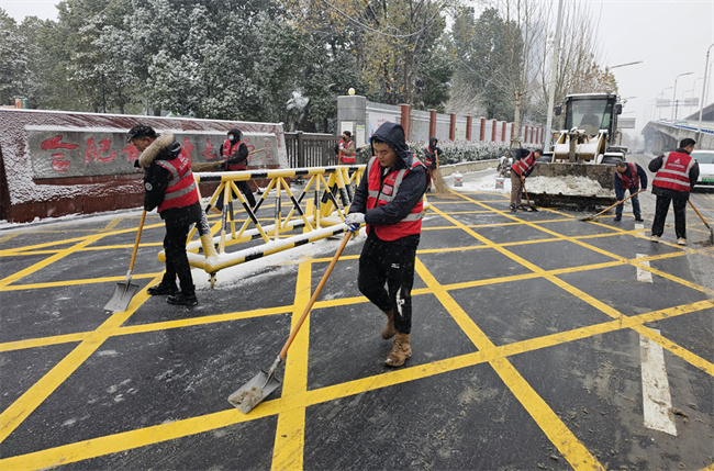 項(xiàng)目員工不畏嚴(yán)寒,團(tuán)結(jié)協(xié)作,揮舞著鐵鍬和掃帚對(duì)路面積雪進(jìn)行清掃,對(duì)施工大轉(zhuǎn)盤(pán)、脊嶺頭、道路主干道、上下坡等重點(diǎn)部位撒布工業(yè)鹽。截至18日中午,共出動(dòng)車(chē)輛4部,人員30余人,撒布工業(yè)鹽30余袋。