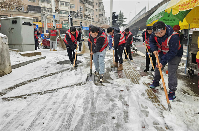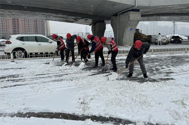 ▲青海路項(xiàng)目由項(xiàng)目經(jīng)理帶隊(duì),發(fā)動(dòng)項(xiàng)目班子及普通員工共17人,使用鐵鍬、掃把、融雪鹽,為青海路撒鹽鏟雪,有效保障了行車(chē)安全,為園博園入園觀賞的游客提供安全保障。