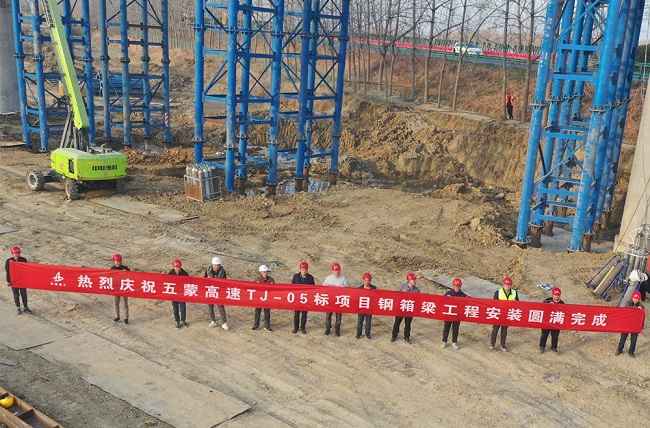 近日,隨著最后一片17.8米長的鋼箱梁緩緩落到指定位置,標志著五蒙高速05標在全線所有標段中首個完成鋼箱梁架設任務。