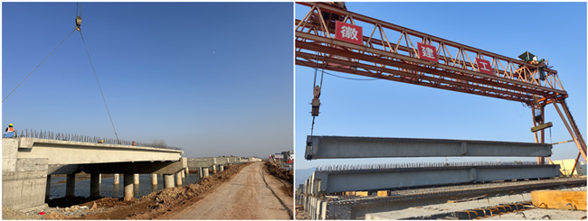 自進場以來,項目部提前謀劃、科學組織建設梁場,圍繞節點目標,進行任務分解。2023年6月10日啟動箱梁首件預制;8月12日首片箱梁在魯坦河大橋順利架設。12月26日完成全線橋梁梁板架設。為保證本次架設施工安全,項目部制定詳細節點計劃,層層壓實責任,詳細制定運梁、架梁專項施工方案,在梁板運輸過程中,整修通道、安排專人盯控,確保預制梁運輸安全有序,同時全面細致地對現場施工技術人員進行技術交底和安全質量交底,嚴格把關每一道施工工序,確保板梁預制、架設等全過程受控。