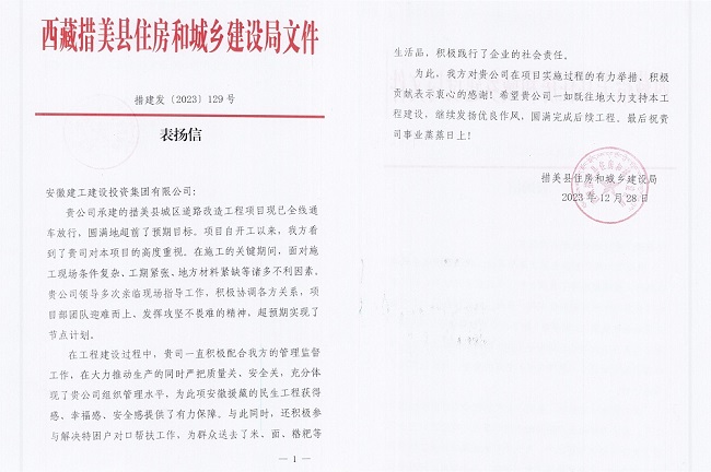近日,建工建投集團收到西藏措美縣住房和城鄉建設局的表揚信。信中對措美縣城區道路改造工程項目團隊科學管理、超預期實現節點計劃提出表揚。