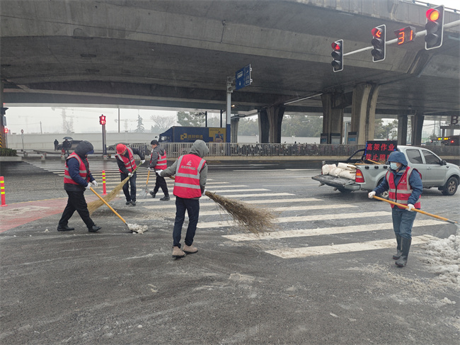 G312合六路(新橋大道-侯店路)項目25名項目管理人員使用鏟車、融雪鹽、鐵鍬、大掃帚,對明理路下穿與北分溪上跨橋輔道及沿線小區非機動車道進行除雪,保障周邊行人通行安全。