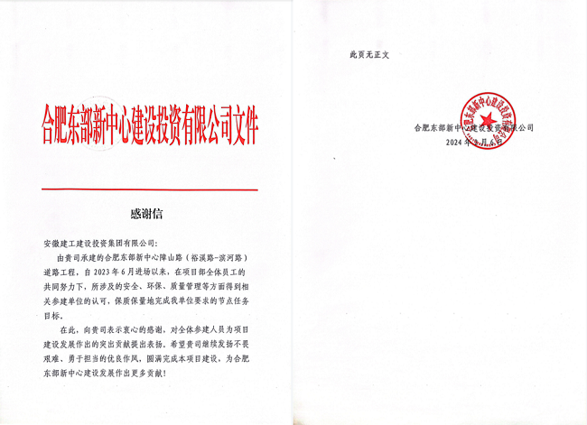 2月6日,合肥東部新中心障山路項目收到合肥東部新中心建設投資有限公司發來的感謝信,信中對項目管理團隊的工作予以充分肯定和表揚,對建工建投集團的大力支持表示誠摯的感謝。