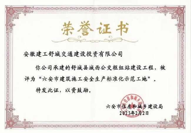 合廬項目獲得省安全文明示范工地,S244項目獲得省級平安工程,舒城城西項目獲得六安市建筑施工安全生產(chǎn)標準化示范工地及集團公司安全文明標準化工地,合周項目榮獲安徽省AAA及環(huán)保施工示范工地。