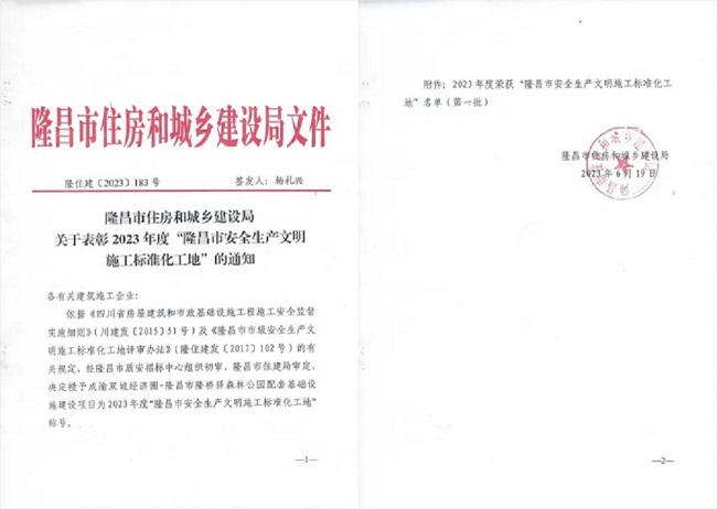 成渝雙城經(jīng)濟(jì)圈隆昌市隆橋驛森林公園配套基礎(chǔ)設(shè)施建設(shè)項(xiàng)榮獲2023年度“安全生產(chǎn)文明施工標(biāo)準(zhǔn)化工地”。