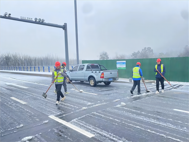 在降雪前,G312合六路(南崗鎮(zhèn)-侯店路)項(xiàng)目提前增加了融雪劑、防滑沙等應(yīng)急物資儲(chǔ)備,根據(jù)降雪量和路面結(jié)冰情況,合理安排除雪作業(yè)計(jì)劃,確保除雪保暢工作的順利進(jìn)行。在工作人員的共同努力下,G312合六路(南崗鎮(zhèn)-侯店路)項(xiàng)目在降雪期間保障了長(zhǎng)江西路與方興大道大交口主線橋良好的通行狀況。