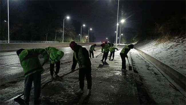銅陵G330項(xiàng)目部扎實(shí)做好低溫、降雪天氣防范應(yīng)對(duì)工作,組織員工開(kāi)展積雪清掃工作。項(xiàng)目部在施工路段拋灑融雪劑,管理人員紛紛拿起鐵鍬和除雪鏟有條不紊的掃雪、鏟冰、融冰,采取了一系列措施清理道路周圍積雪,他們不畏嚴(yán)寒、緊密配合,最終清理出一條“安全通道”。
