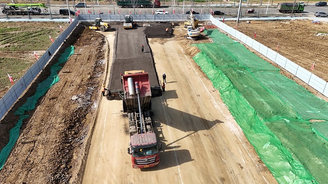本次水穩(wěn)攤鋪首件施工位于先進(jìn)光源連接通道(南)K0+015-K0+094.98段全幅機(jī)動(dòng)車道,寬度14米,全段水穩(wěn)攤鋪面積達(dá)1215平方米。