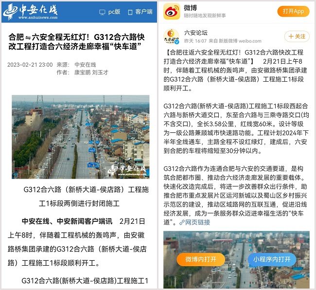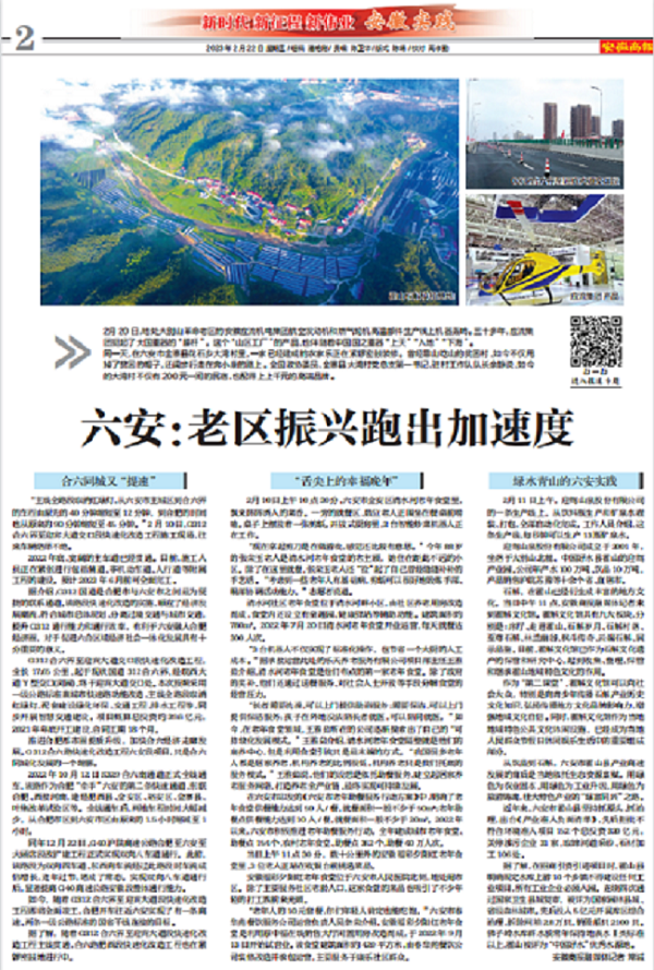 2月22日,在《安徽商報(bào)》專版“新時(shí)代新征程新偉業(yè)——安徽實(shí)踐”主題專版稿件《六安:老區(qū)振興跑出加速度》中,在“合六同城又提速”模塊,特別報(bào)道路橋集團(tuán)G312項(xiàng)目為六安城市發(fā)展作出交通貢獻(xiàn)。