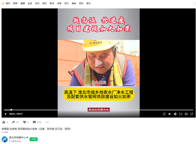 7月24日,淮北市廣播電視臺視頻號“淮北市傳媒中心”報道淮北市供水管網項目在高溫天氣戰高溫,搶進度,項目建設如火如荼的場面。