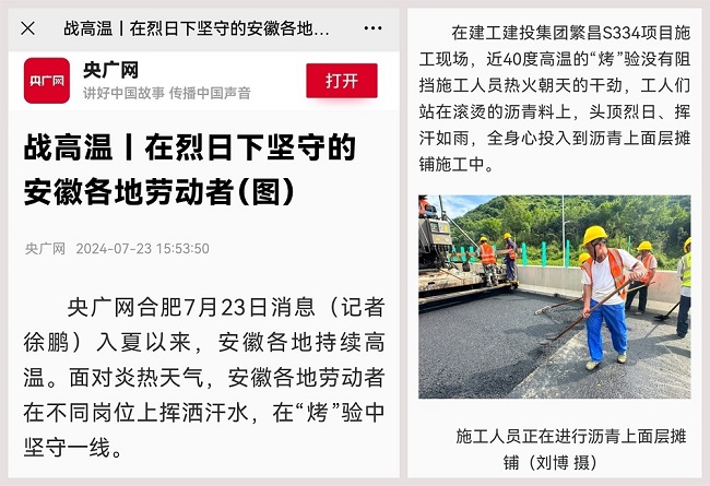 報道中指出:在建工建投集團繁昌S334項目施工現場,近40度高溫的“烤”驗沒有阻擋施工人員熱火朝天的干勁,工人們站在滾燙的瀝青料上,頭頂烈日、揮汗如雨,全身心投入到瀝青上面層攤鋪施工中。