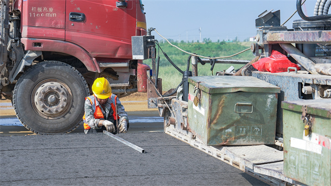 為確保水穩(wěn)底基層施工優(yōu)質(zhì)高效完成,項(xiàng)目團(tuán)隊(duì)科學(xué)制定施工方案,提前組織施工人員進(jìn)行技術(shù)交底和安全教育,儲(chǔ)備充足原材料,為水穩(wěn)底基層攤鋪?zhàn)鲎銣?zhǔn)備工作。攤鋪前,項(xiàng)目部進(jìn)行了壓實(shí)度、彎沉試驗(yàn),并對(duì)水穩(wěn)材料配合比、攤鋪速度、碾壓工藝等進(jìn)行了數(shù)論驗(yàn)證。施工過程中,項(xiàng)目管理人員到位盯崗,嚴(yán)格執(zhí)行標(biāo)準(zhǔn)化施工要求,并在現(xiàn)場準(zhǔn)備了充足的解暑飲品和藥物,保證作業(yè)人員施工安全。