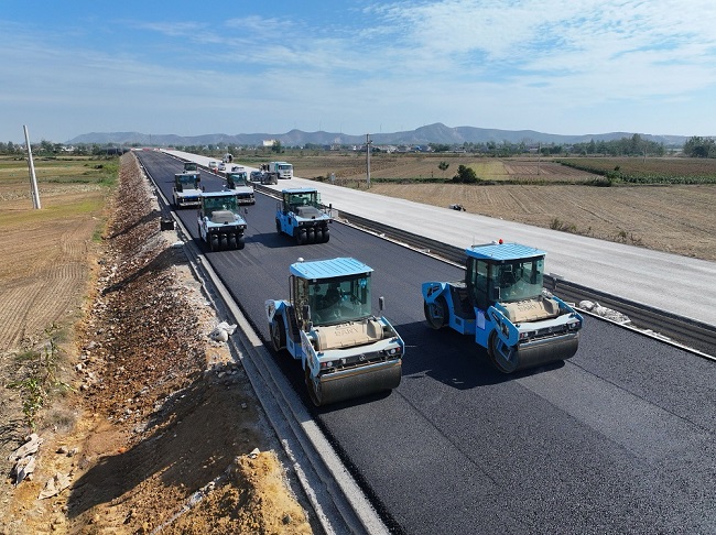徐淮阜高速項目施工現(xiàn)場熱火朝天,建工建投設(shè)備租賃公司智能化攤壓設(shè)備正在夜以繼日的進行無人駕駛攤壓施工。