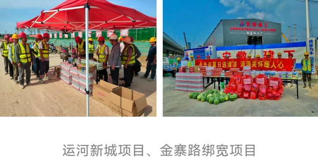 6月10日起,安建交建公司各項目分別組織安全部、綜合部等工作人員為奮斗在一線崗位的作業人員送去防暑藥品、西瓜、礦泉水、綠豆等防暑降溫物品,并在施工現場設置休息區、茶水亭等,為施工人員提供休息和避暑的場所,為奮戰在施工一線的員工送去關懷和問候。
