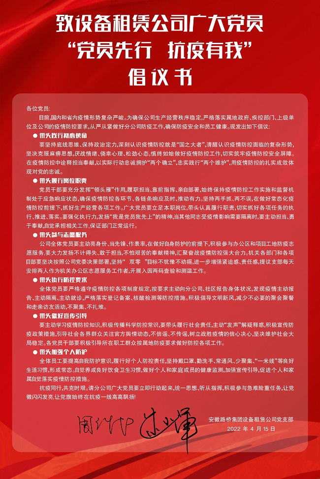 4月18日, 設(shè)備租賃公司分公司黨支部發(fā)出《“黨員先行 抗疫有我”倡議書》,號(hào)召全體員工特別是黨員干部堅(jiān)決貫徹習(xí)近平總書記重要指示精神,按照建工控股黨委和公司黨委部署要求,充分發(fā)揮黨員干部的主體作用,為打贏這場(chǎng)疫情防控攻堅(jiān)戰(zhàn)貢獻(xiàn)自己的智慧和力量。