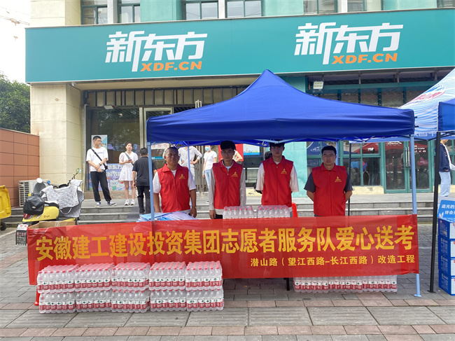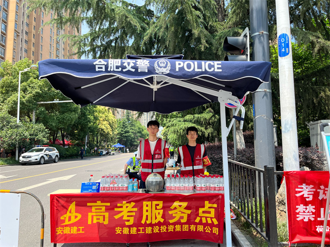 金寨路高架橋綁寬項目組織共青團員成立一支高考志愿服務隊,在考點外設置“高考服務點”,向有需要的考生和家長免費發放考試必備文具、礦泉水、防曬帽及防暑降溫等愛心物資,為考生送去一聲聲“加油”鼓勁聲,為場外等候的家長提供休息凳、涼棚和祝福。